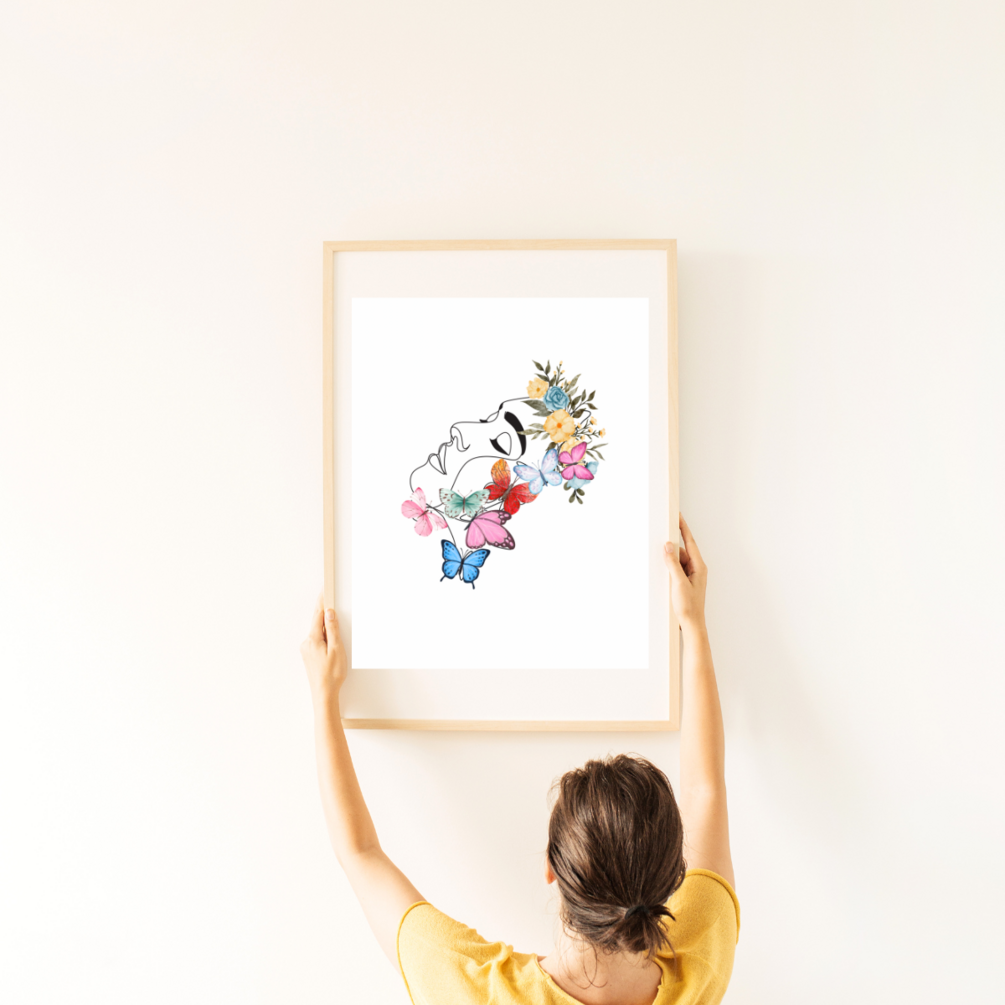 Woman Face with Colorful Butterflies Art, Line Art Female, Abstract Face by One Line Drawing with Colorful Butterflies, DigitalDownload Only.