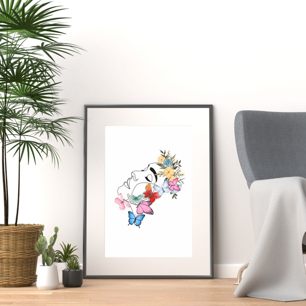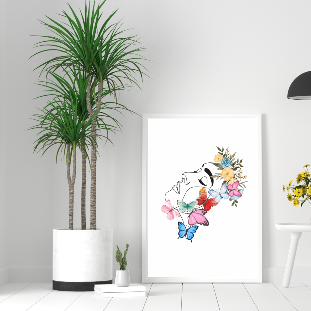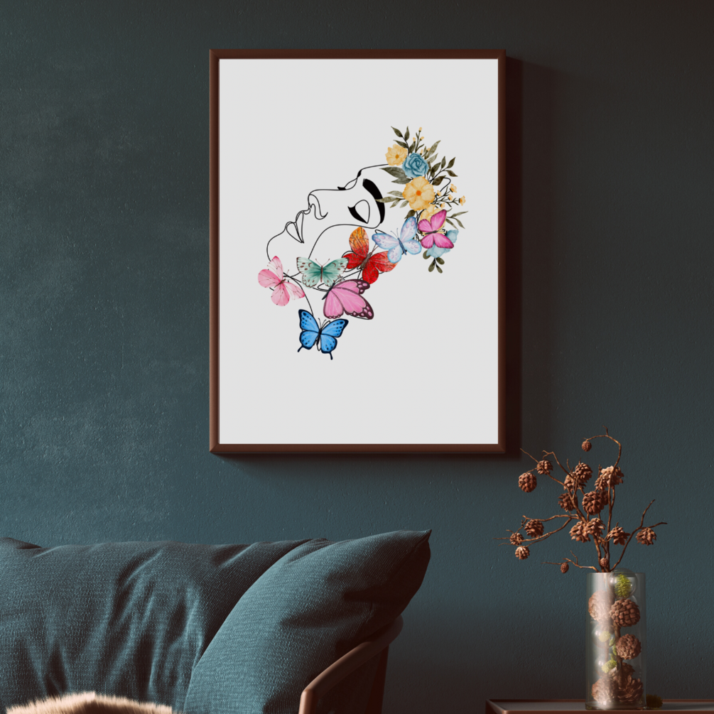 Woman Face with Colorful Butterflies Art, Line Art Female, Abstract Face by One Line Drawing with Colorful Butterflies, DigitalDownload Only.