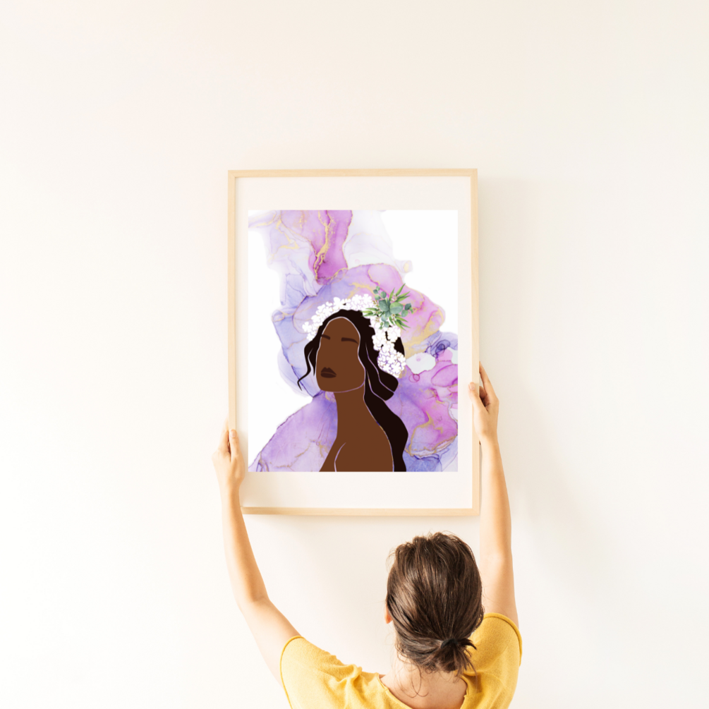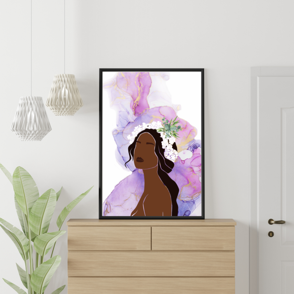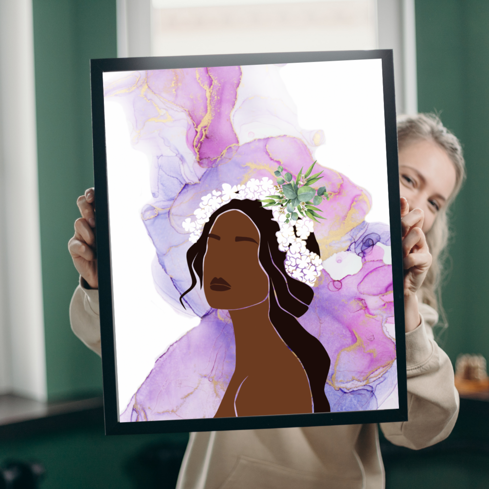 Black Woman Wall Art Printables, Dreamy Woman with Flowers in Hair, Abstract Wall Art , Digital Download Only.